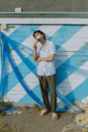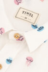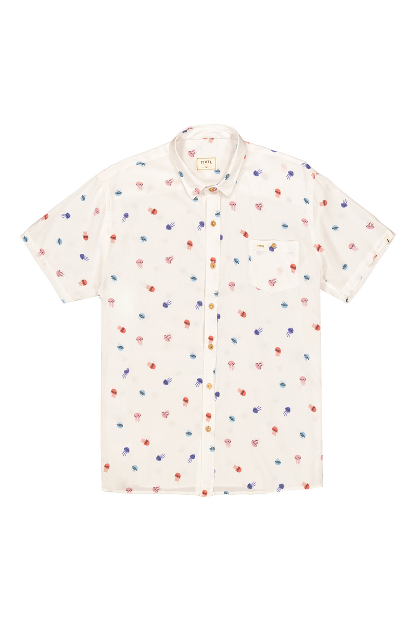 Camisa Stavro, de manga corta en color blanco y composición 100% soft viscose. Decoración y estampado suave a mano all-over-print (AOP) con diferentes tipos de medusas multicolores. Ecoprocesado por OEKO-TEX para la nueva colección primavera-verano ‘Ocean collection’.